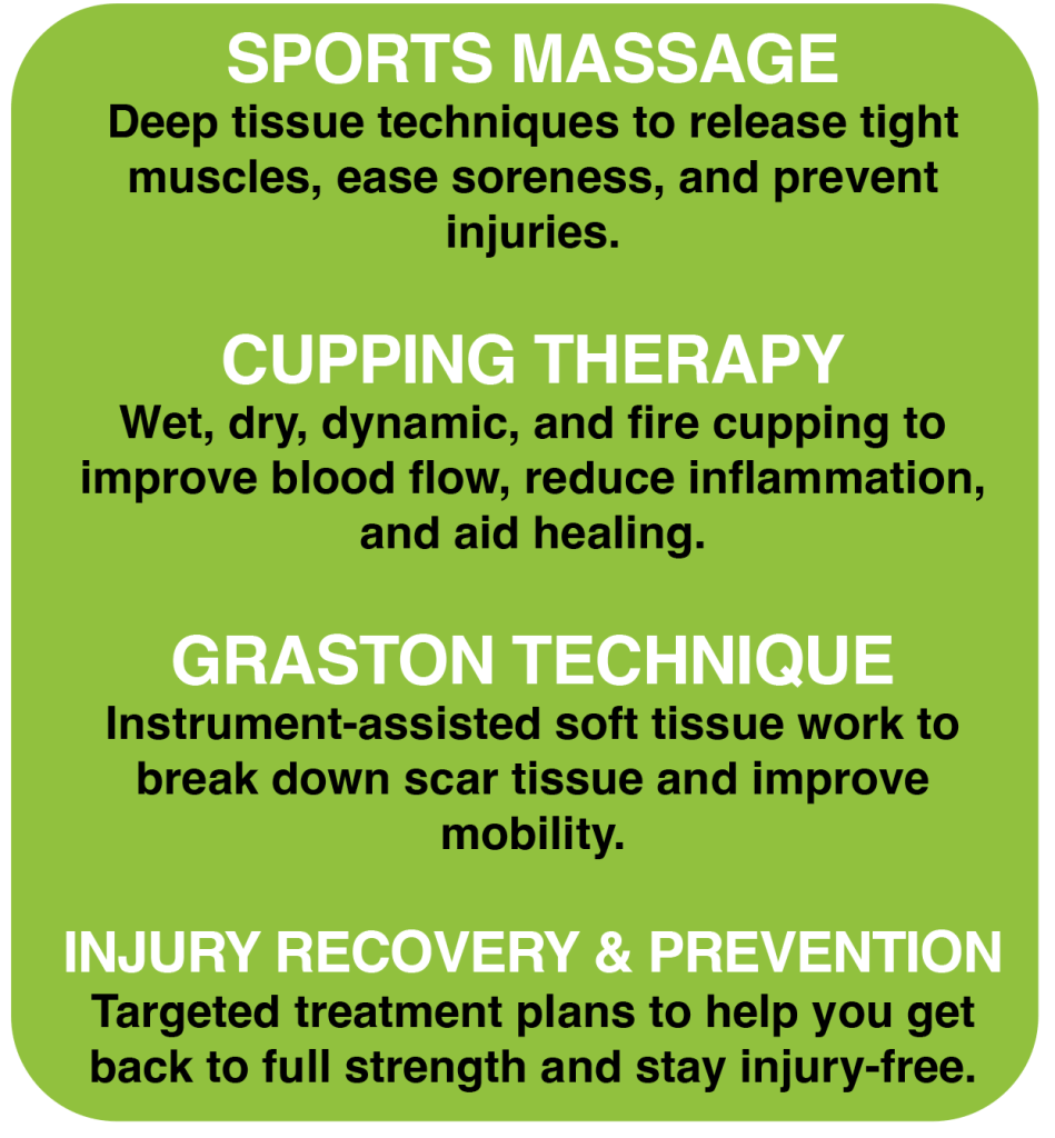 I’m passionate about helping people move better, recover stronger, and perform at their best. With experience in treating sports injuries, chronic pain, and post-surgery recovery, I combine traditional massage with advanced techniques like cupping and Graston to give you the best results possible.